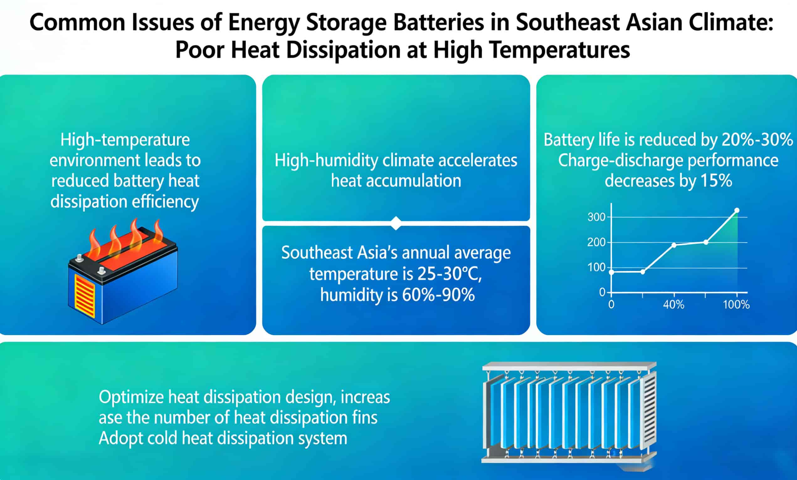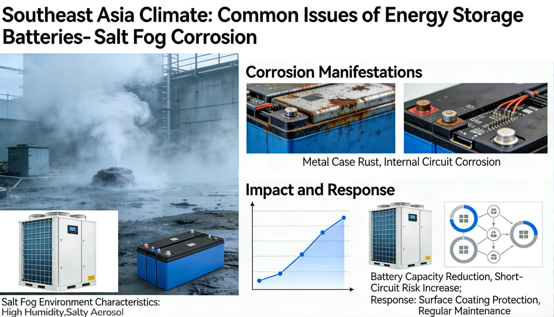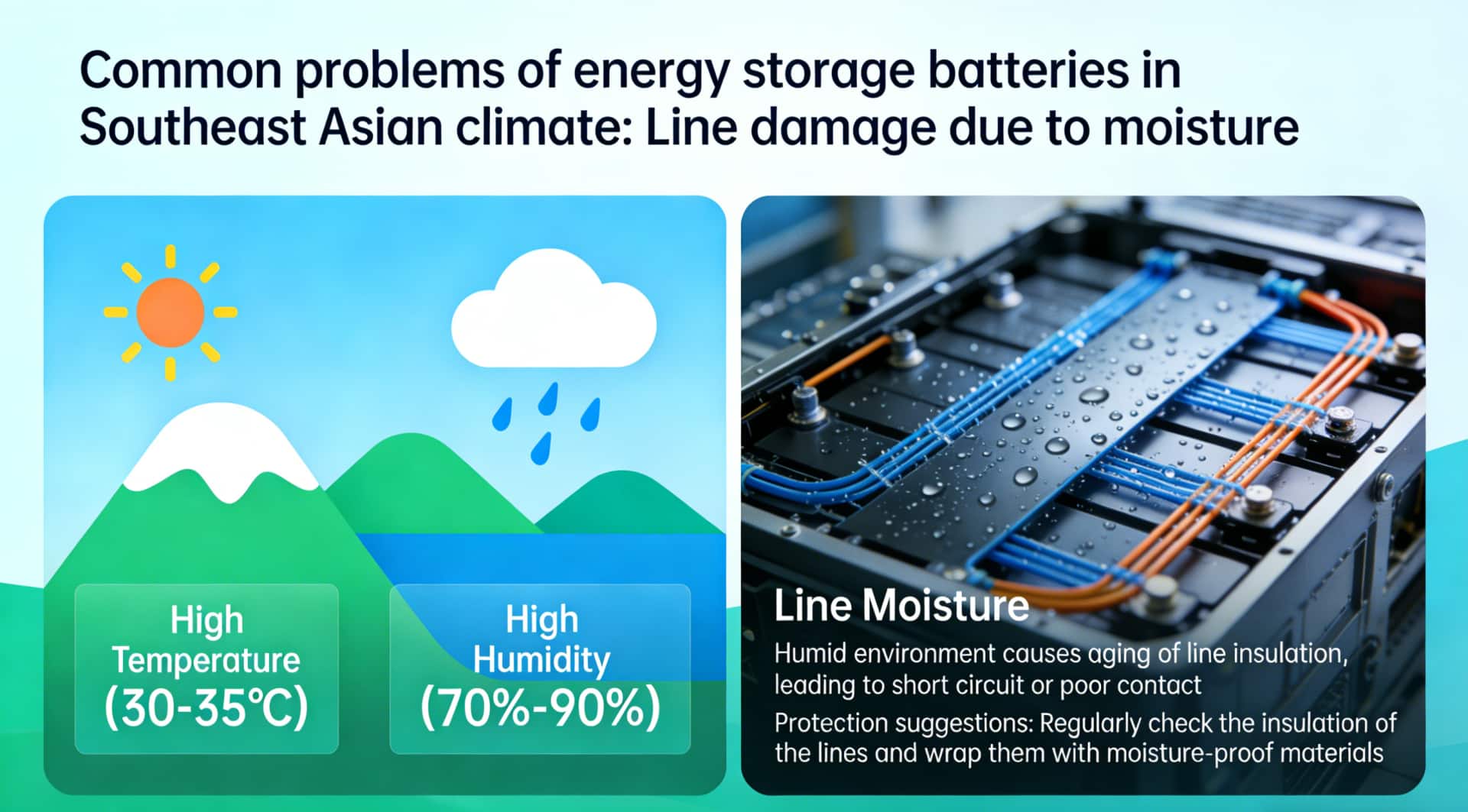 Figure: Common Problems of Energy Storage Batteries in Southeast Asia’s Climate (Poor heat dissipation at high temperatures / Circuit moisture damage / Salt spray corrosion)