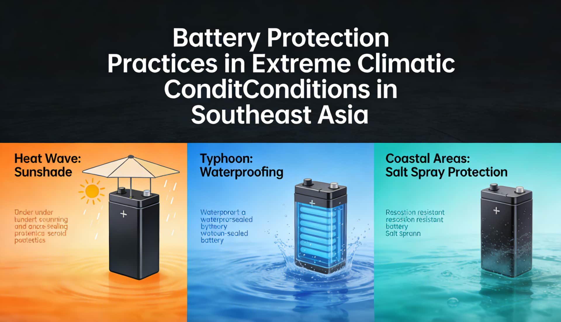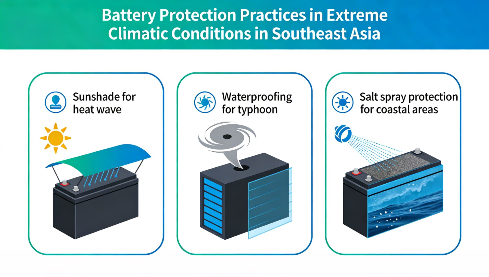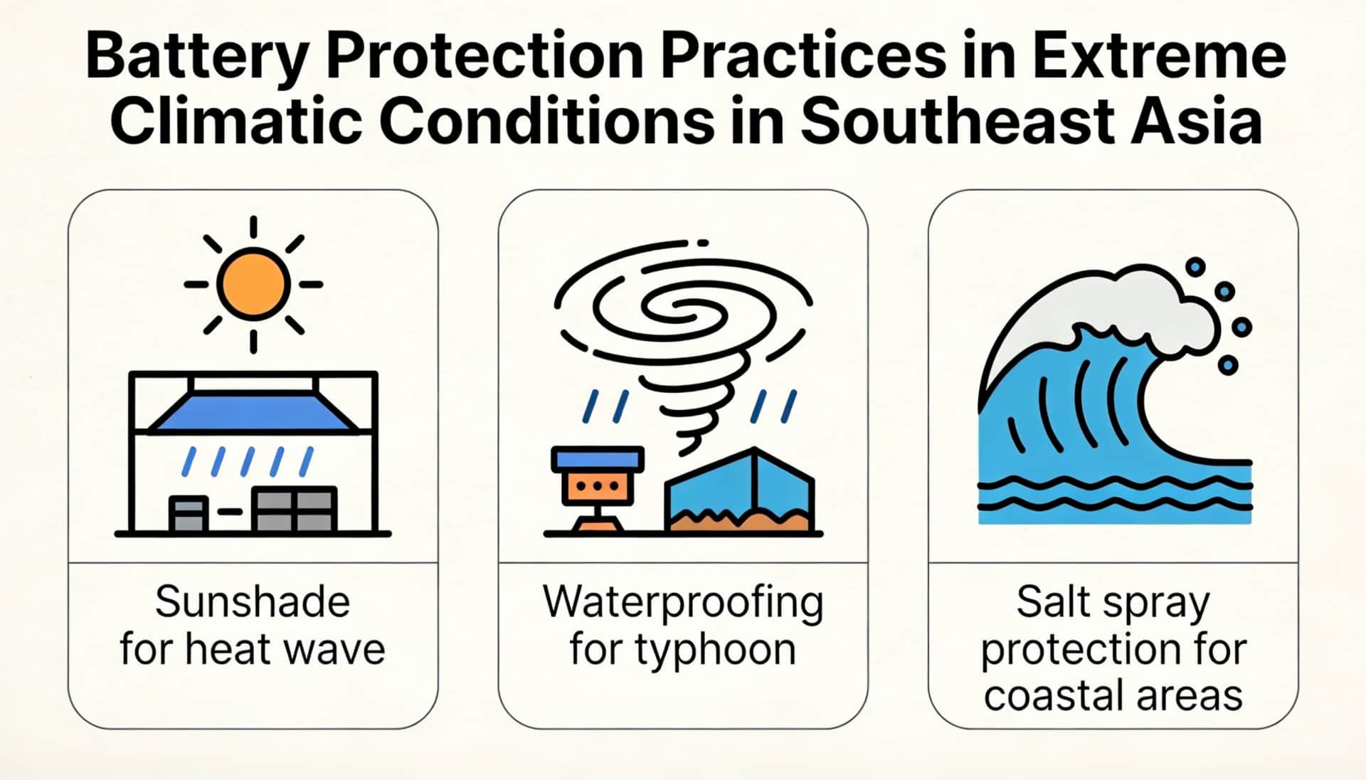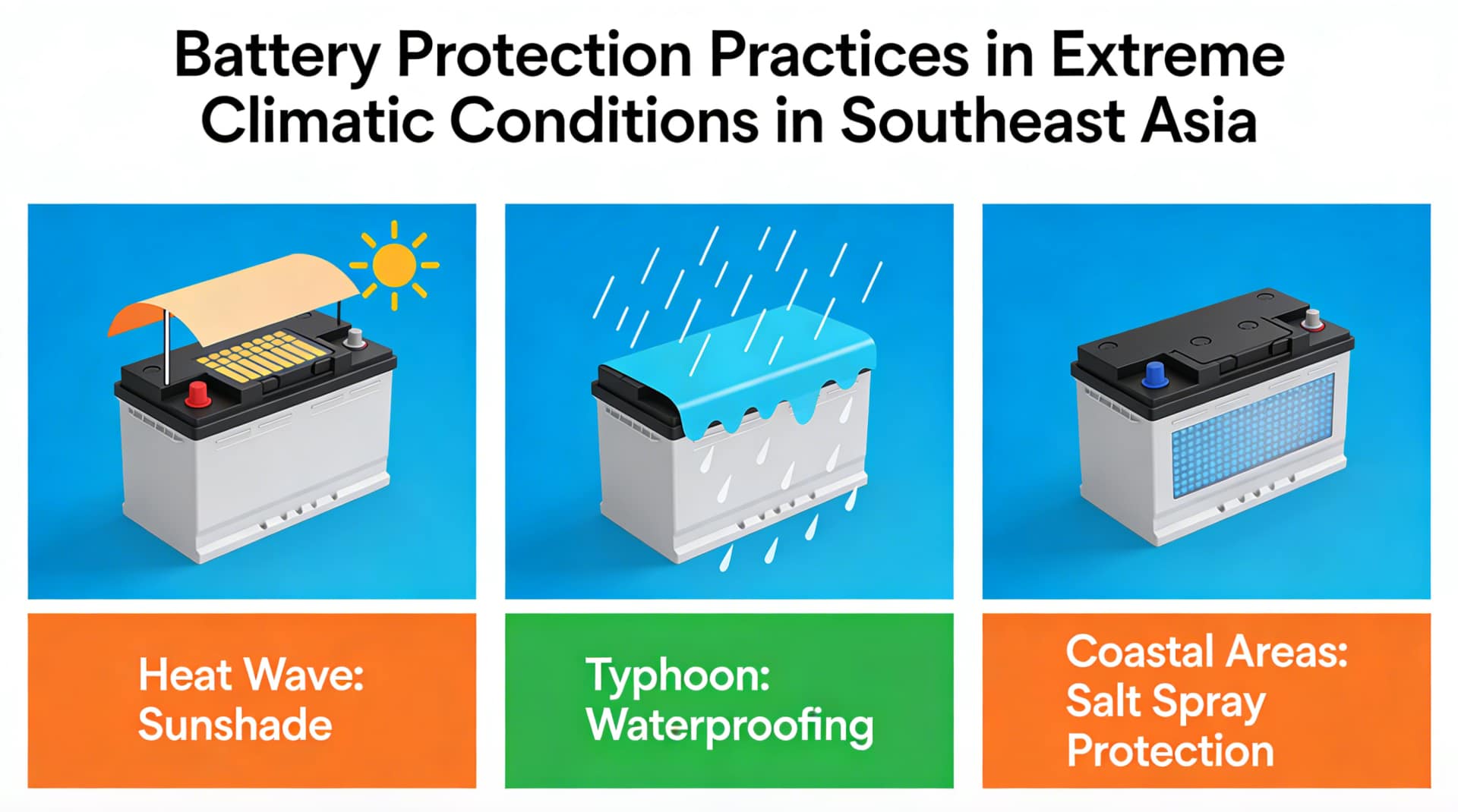 Figure: Battery Protection Practices in Extreme Climatic Conditions in Southeast Asia (Sunshade for heat wave / Waterproofing for typhoon / Salt spray protection for coastal areas)